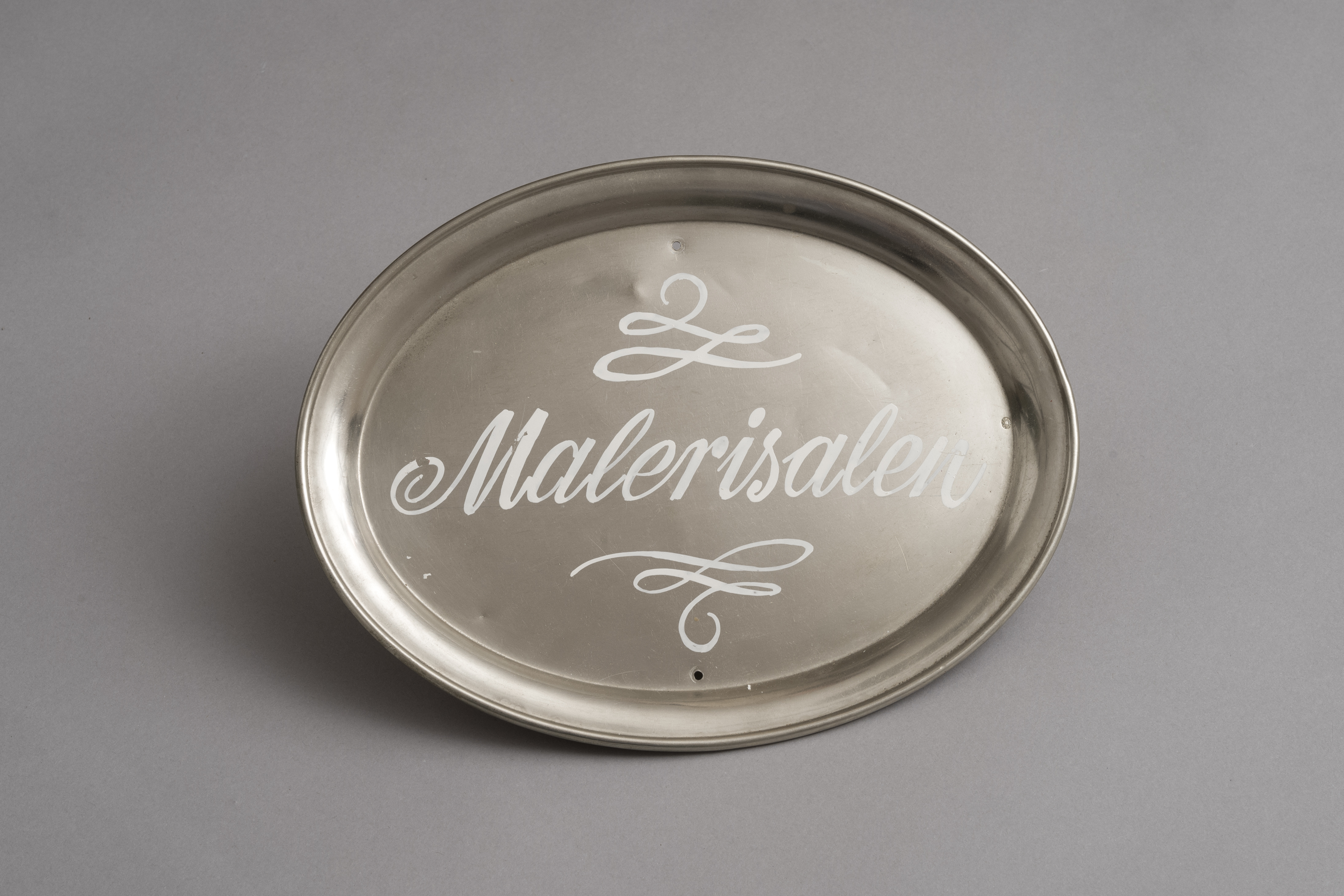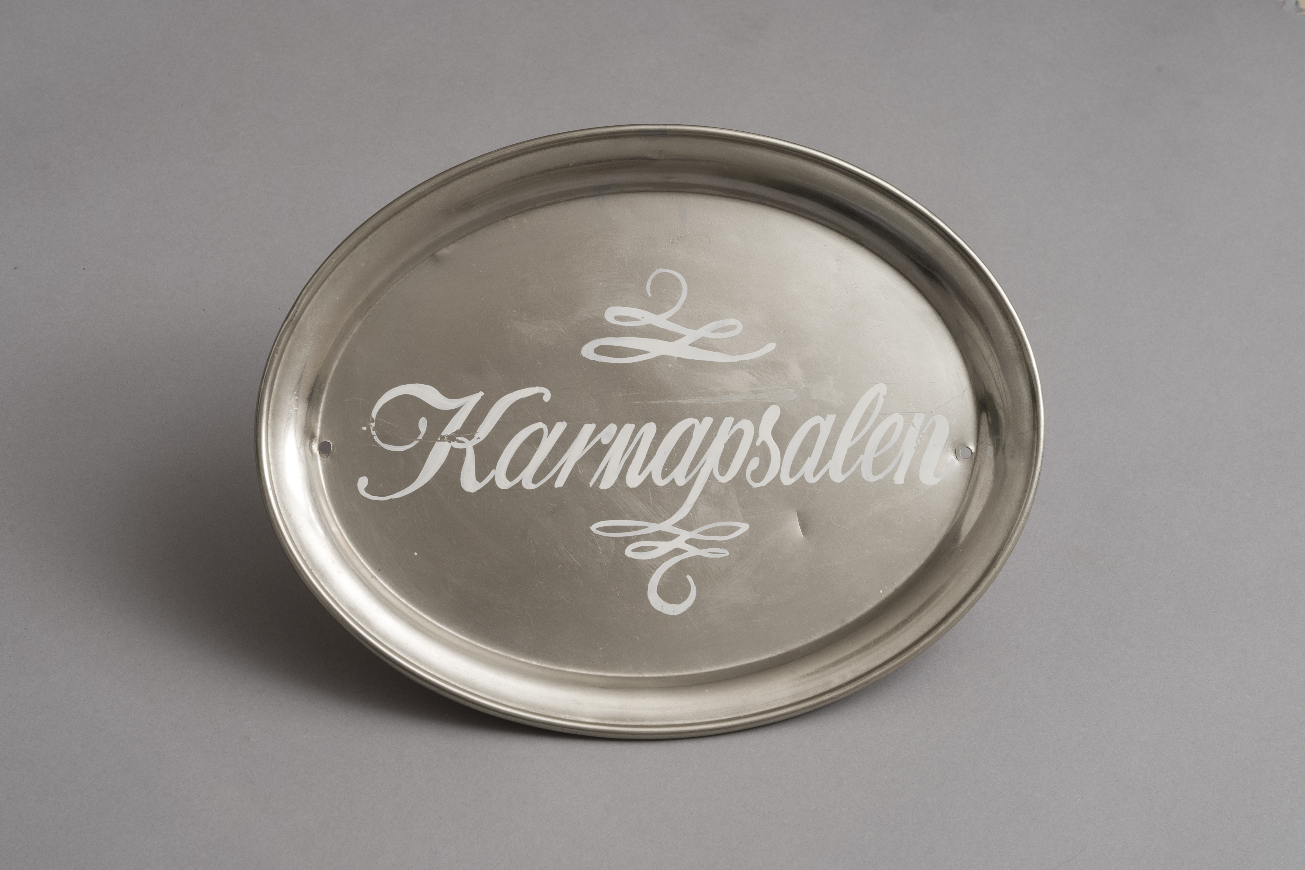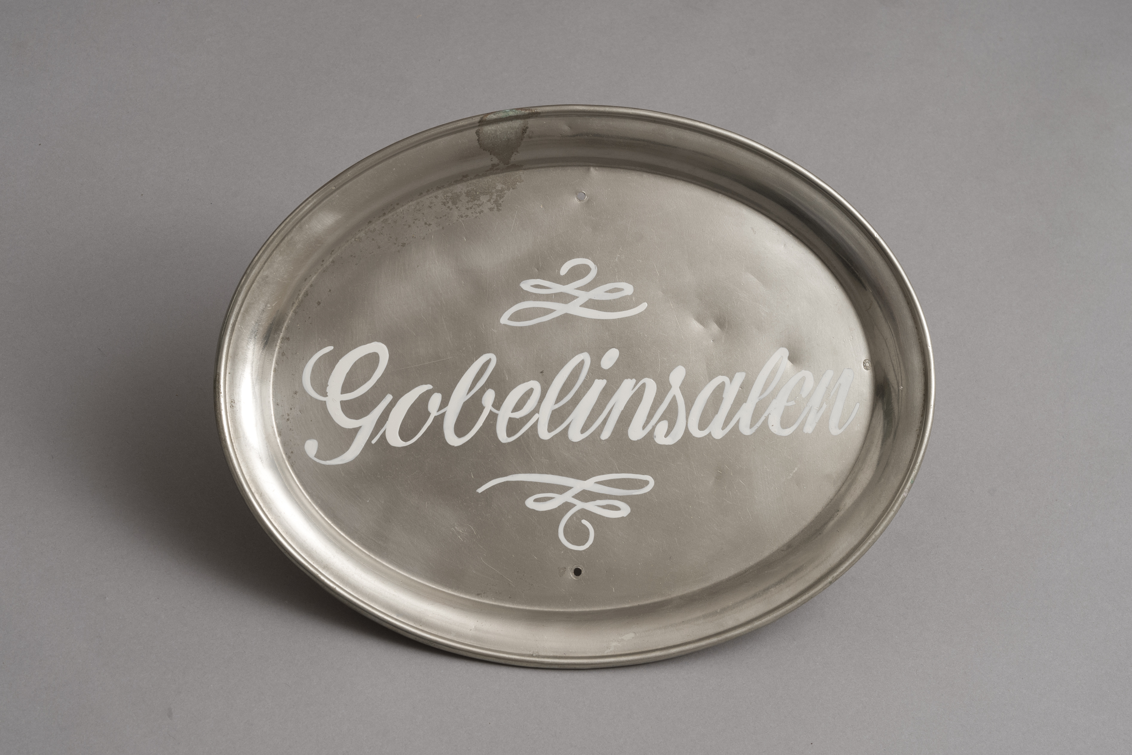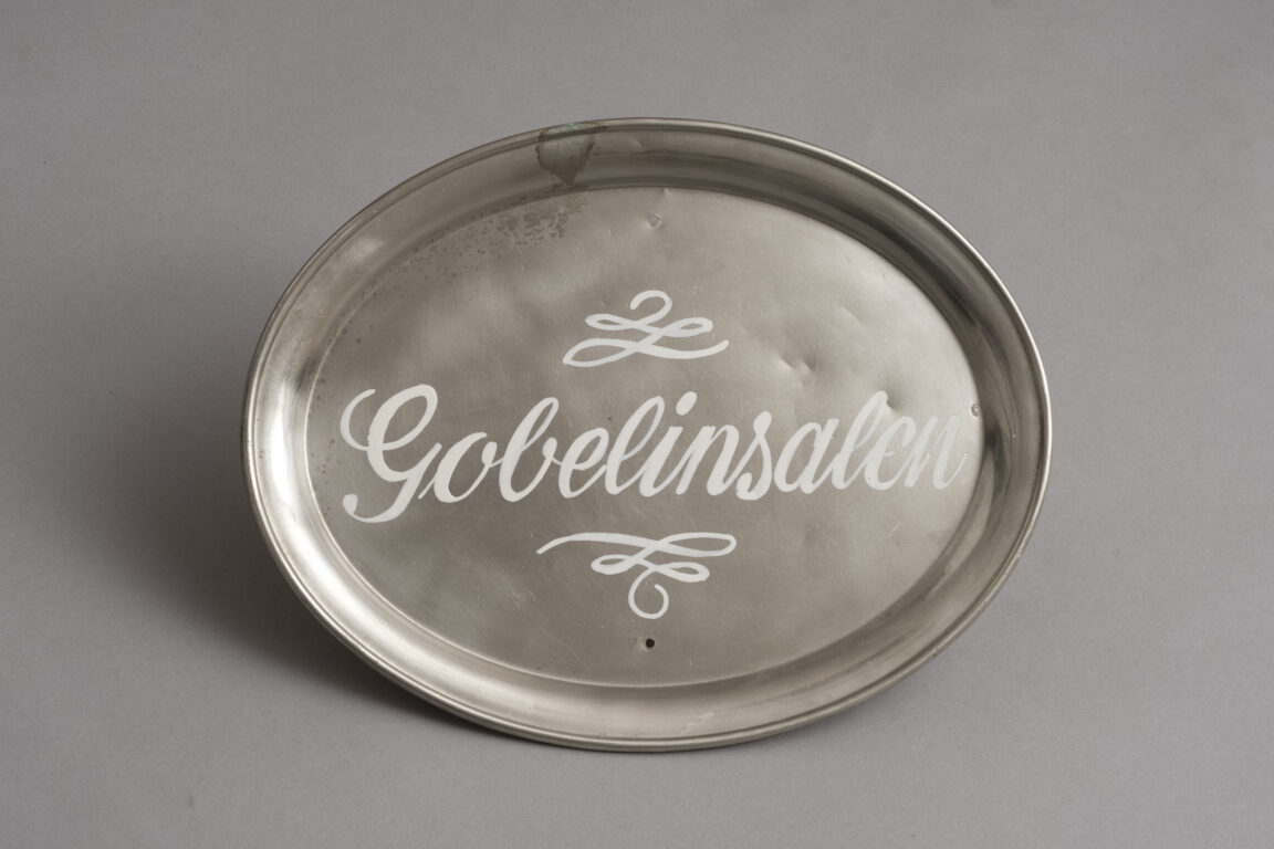 Skilte i form af stålserveringsfade med navnene "Gobelinsalen, "Malerisalen" og "Karnapsalen".