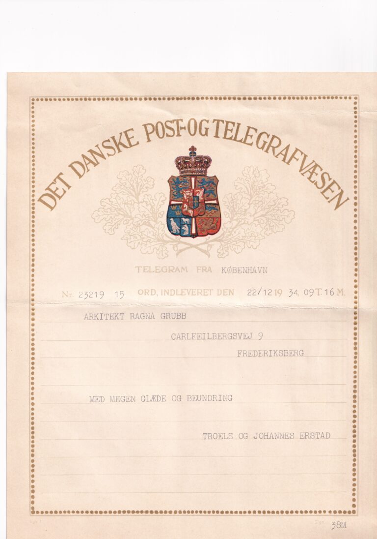 Lykønskningstelegram. Afsender Troels og Johanne Erstad.