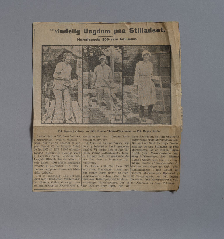 Kvindelig ungdom på stilladset. Frk. Karen Jacobsen. Frk. Rigmor Thrane-Christensen. Frk. Ragna Grubb.