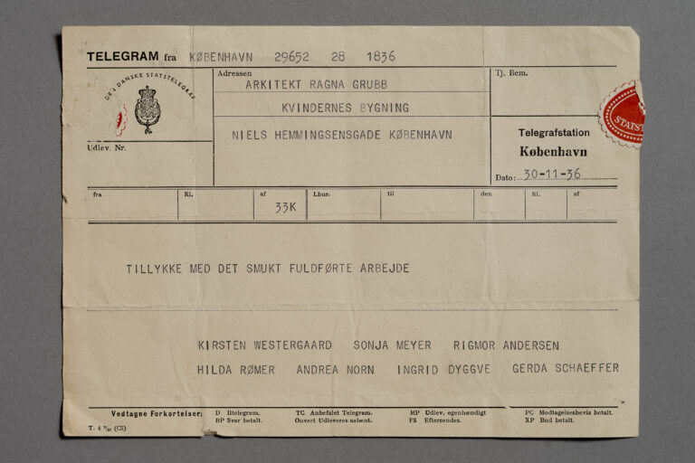 Lykønskningstelegram tildelt arkitekt Ragna Grubb. 1936.